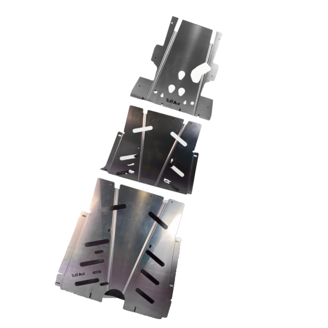 Designed to integrate seamlessly with Tuffant Rock Sliders, this 3-piece system is crafted to protect critical components like your engine, gearbox, and factory fuel tanks! Made from premium 5mm Aircraft Aluminium, this armour offers durability without adding excess weight, ensuring your New Defender is prepared for the most challenging terrains!